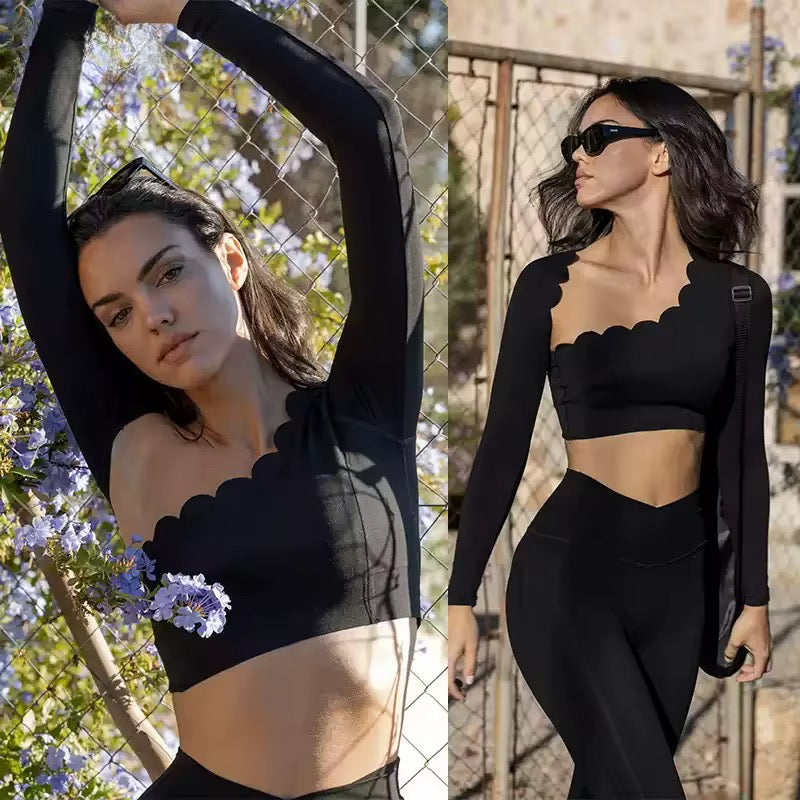 Sa coupe ajustée, ses bords délicatement ondulés et son tissu extensible et respirant épousent le corps sans compression. Polyvalente, elle s’adapte aussi bien aux séances de yoga et de pilates qu’à un look lifestyle chic et minimaliste.