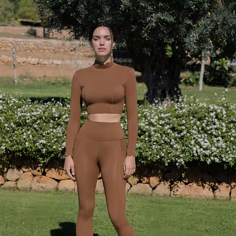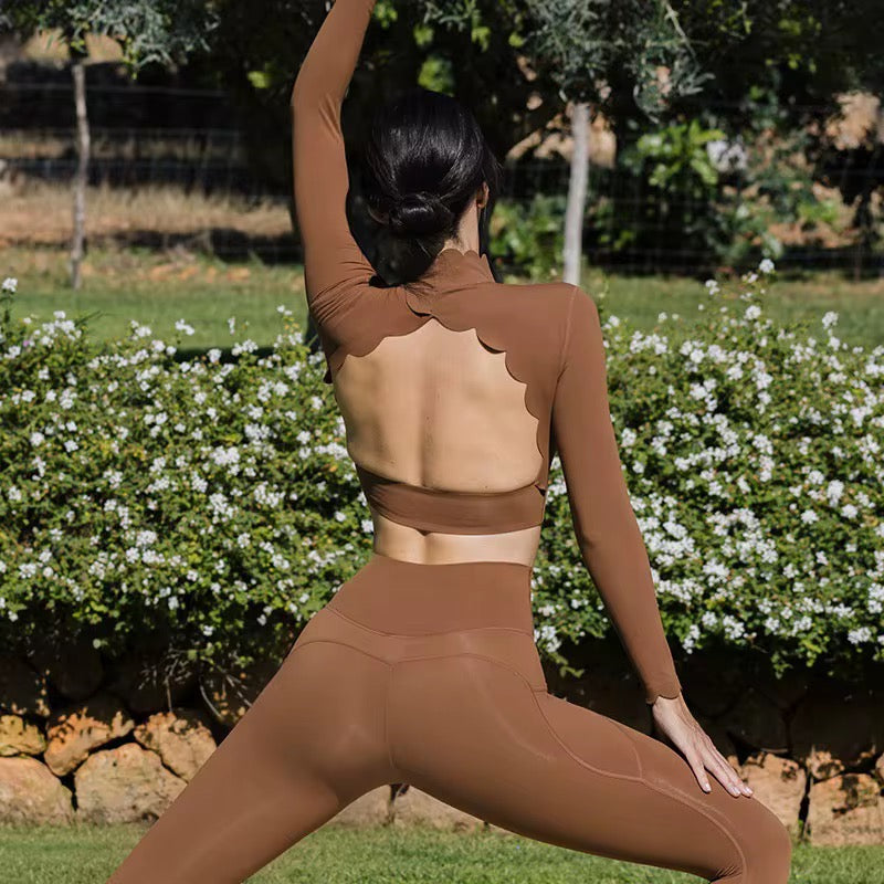 Sa coupe manches longues associée à un dos ouvert délicatement dessiné crée un équilibre parfait entre maintien, féminité et liberté de mouvement.